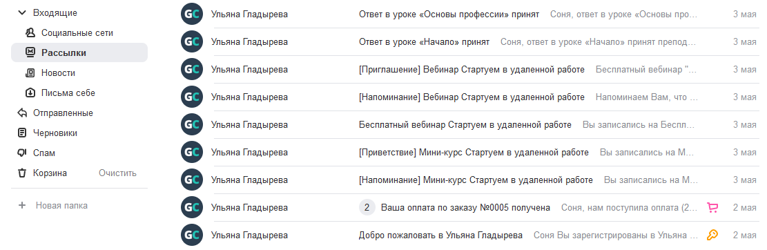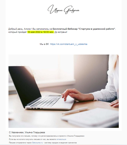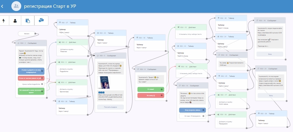 Создаю одну авторассылку из серии сообщений на оба канала. Так как автовебинар идет каждый день, то я задала время для каждого сообщения: если подписчик зарегистрировался сегодня до начала вебинара, то ему приходит приглашение на сегодняшний эфир; если после начала вебинара, то приходит другое сообщение с приглашением на завтра. Плюс 2 напоминания о начале с ссылкой на вебинарную комнату.