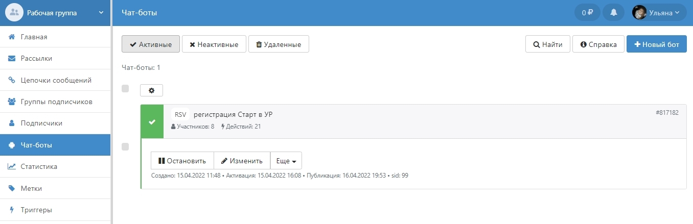 Для оповещения об уроке необходимо разместить пост в группе или сделать разовую рассылку по подписчикам. Для этого создаю разовую ручную рассылку (исключаю по метке тех, кто уже получал), создаю нового бота, который запускается по ключевому слову. Тригером будет «хочу урок». Бот предлагает записаться на урок: оставить свой телефон и удобное время. Данные подписчика отправляются на email администратора. Далее администратор связывается с подписчиком.